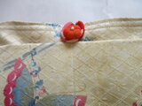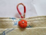 中袋には正絹の女の子の着物を使い、中ポケットを1つ付けています。中綿を入れ、ポーチの口に花のボタンとループの輪っかを付けて、ポーチの口を止めるようにしています。