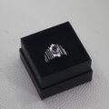 素材は925スターリングシルバーを使用し、変色を防ぐロジウム加工が施されています。中央には**ナチュラルなオーバルカットのアメジスト(6×8mm)**をセッティング。深みのあるパープルの輝きが、落ち着いた華やかさと気品を演出します。