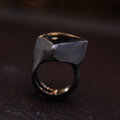 石の形からのインスピレーションで左右の腕の太さが違うアシンメトリーフェイスのリングです。