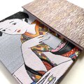 夢二のリトグラフ作品を織物にした絵を表面に、裏面に夢二アートをハイライトする織物と工芸が融合するデザインです。大正ロマンの抒情美と織物の質感・意匠性が併存する作品です。