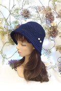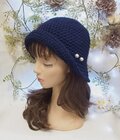 秋 冬 帽子 バケットハット パールブローチ付き ネイビーロイヤルブルー