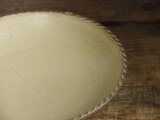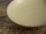 素地に格子模様をつけ縁飾りを施してから化粧泥を掛け伊羅保釉で焼成しています。