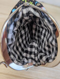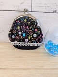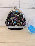 黒地に色とりどりの花々がいっぱいの、可愛くて華やかながま口です。色とりどりの花がまるで小さなお庭のようです。下部には丸い花に合わせて、丸い小さな白のレースをあしらいました。