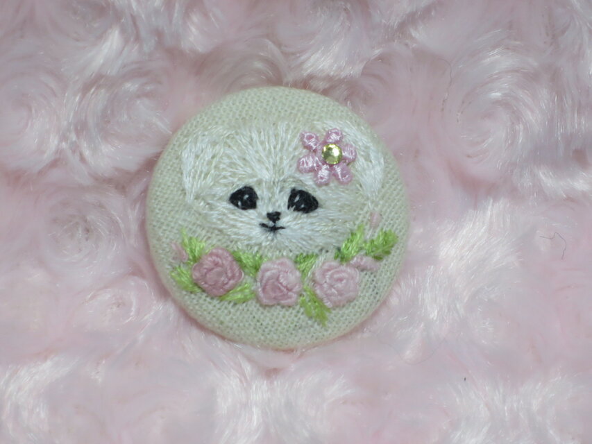 ご覧頂きありがとうございます。 マルちゃんと薔薇の刺繍です。 ひとつ 一つ手刺繍で作っています。 どうぞ宜しくお願い致します。 〈 サイズ 〉 くるみボタン38 mm