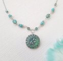 エメラルドグリーンに輝く ✧ チェコガラスボタンとターコイズビーズのネックレス kn1002