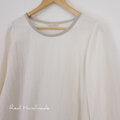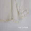 襟ぐりはリネンでぐるりとパイピング。袖口に“ギャザーラッセルレース”を飾った