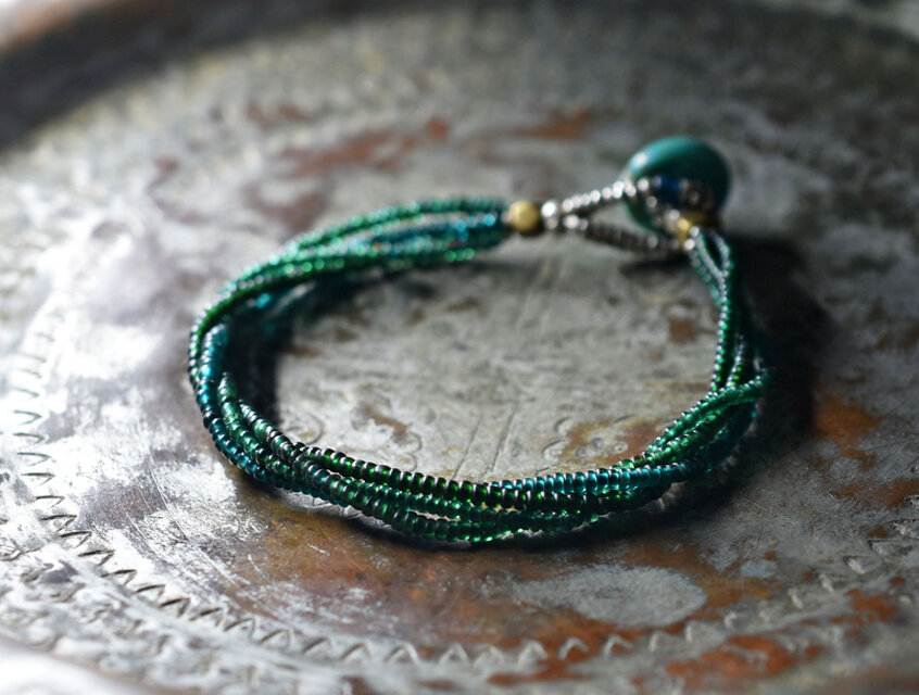 グリーンのビーズはインドへ渡った古いシードビーズです。