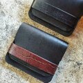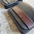 型押しクロコの帯にフラップを抜き差しし開閉するタイプのお財布。
