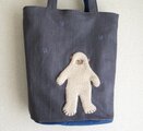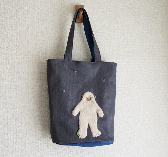オフホワイトのモコモコはウールで、顔は革の裏表。