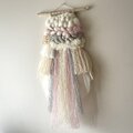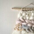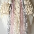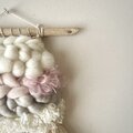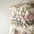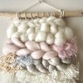 みるく色のふわふわの羊毛とスモーキーなピンク、ブルーグレー、ベージュなどの柔らかなお色を組み合せ、ふわもこ可愛らしいタペストリーに仕上げました。