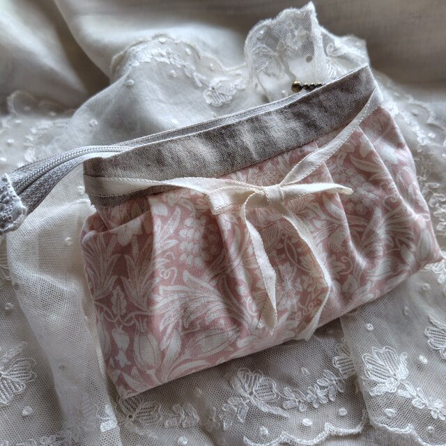 ウィリアムモリスのくすみピンクサンフラワーとナチュラルリネンのタックポーチです。