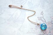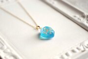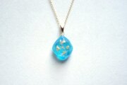 二種類のブルーのレジンと散りばめた金箔、そして角度を変えるたび煌めくオレンジ色の光沢が美しいペンダント。