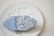 草花をモチーフに消しゴムはんこを彫り、はんこを陶土に捺しつけて凹凸の模様をつけたブローチです。