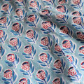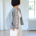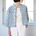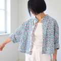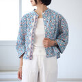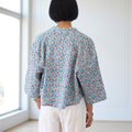 爽やかなブルー地に草花モチーフをあしらい、すっきりとしたスタンドカラーと前立て部分の切り替えがデザインのアクセントになっています。