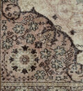 存在感あるコロンと丸いオスマンメダリオンを囲む、ペールピンクと美しいレースデザインのトルコヴィンテージラグ