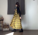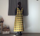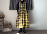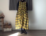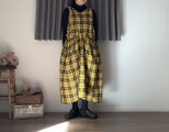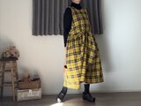 新作**イエロー**タータン**.綿麻 CottnLinenギャザーポケット2wayエプロンワンピース 前後で着用OK