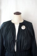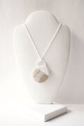 ネックレス部分には、ホワイトのアンティークビーズと現行のシードビーズを交互に通しています。細かなカットが入ったヴィンテージのガラスボタンが留め具になっており金具を使用していない為、金属アレルギーの方も安心してお使い頂けます。裏側には革の素材を使用し、手仕事にて縫い留めています。