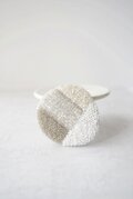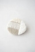 グレー、クリア、乳白色のミルクベージュ、ホワイトのアンティークビーズはそれぞれ形状も大きさも異なりますが、美しく調和し柔らかな雰囲気を醸しだしています。境目にはシルバーの糸でフレンチノットステッチを施し輝きがアクセントになっています。