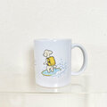 黄色いランドセルを背負った、小さな犬のキャラクターが波に乗るイラスト。