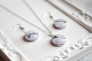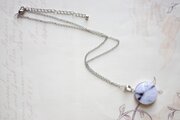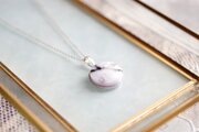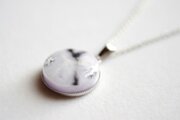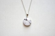 白と紫のマーブル模様のレジンに白と黒でラインを引いた、天然石風の模様が独特のニュアンスを生んでいるペンダント。