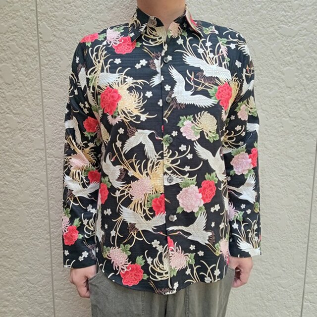 長袖和柄シャツ(鶴と糸菊)