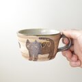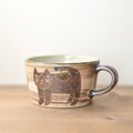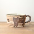 今日届きましたよ〜、とても嬉しいです♪。なんといっても、ハチワレネコちゃんが優しくて、ひょうきんな姿がバランス良く配置され、とてもいい感じです♪ 釉薬のかかったアクセントは写真からは気がつきませんでしたが、うまくまとまって、さらに奥行きが現れてます!ありがとうございました♪