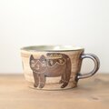 今日届きましたよ〜、とても嬉しいです♪。なんといっても、ハチワレネコちゃんが優しくて、ひょうきんな姿がバランス良く配置され、とてもいい感じです♪ 釉薬のかかったアクセントは写真からは気がつきませんでしたが、うまくまとまって、さらに奥行きが現れてます!ありがとうございました♪