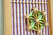2mm幅のヒノキを格子状に組み、その上に麻の葉組子を置いた面白い試みのウォールデコです。
