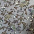 深藍〜青緑の葉と、葡萄色・白藍の小花がリズムを刻み、ところどころに繊細な描き込みがクラシックな奥行きを生みます。