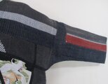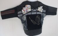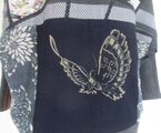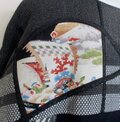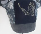 消防団服と蝶の型染めの生地と菊の花の型染めを組み合わせて作りました。