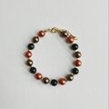 こちらはガラス素材の原玉に、オリジナルカラーのパール塗料にて何層にも渡り重ね塗りを施した日本製ガラスパールブレスレットになります。パールカラーはきめ細かい質感と程良い艶感が特徴のコーラルルージュ・ブラック・ブラウンの3色を使用。パールサイズは直径約8mmで、長さは金具類も含む全長約18cm。テールエンドに短めのアジャスターを付けており約2cm程調節が可能です。パール間には金メッキのスクエアビーズを使用。