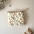みるく色の羊毛をたっぷりと使用し、極細糸やファンシーヤーン等と組み合わせ素材感も楽しんで頂けるよう織りあげた、一点もののタペストリーです。
