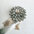 つまみ細工の花は、グリーンで縁取ったクリームホワイトの花びらを幾重にも重ね、上品で美しく仕上げました。