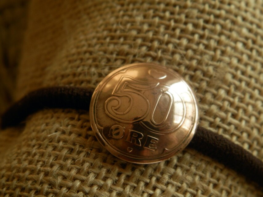 デンマーク50øreをヘアゴムと芯合わせしコンチョ型に加工した作品です。