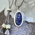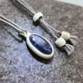 鹿角を削り出した土台に、深い群青色の中に星屑のような煌めきを秘めたアイオライトサンストーンを埋め込み、ペンダントに仕立てました。