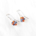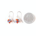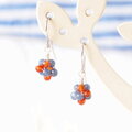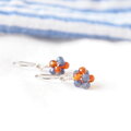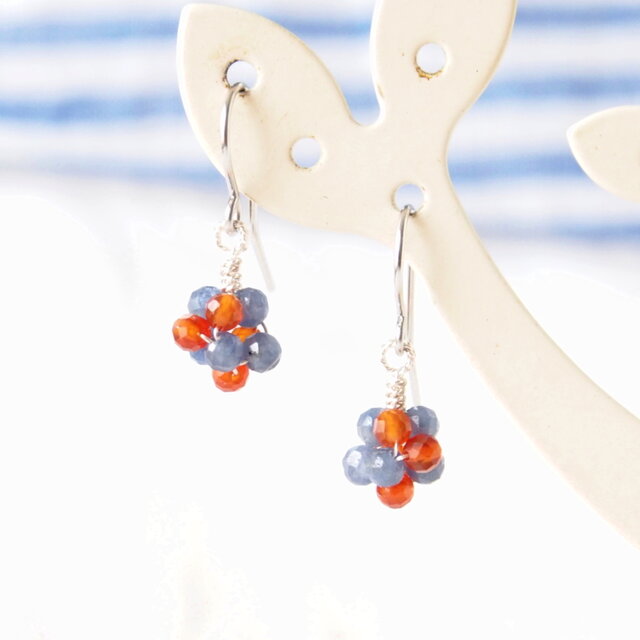 グレーを帯びたブルーのサファイアとほんのり透明感のあるオレンジ~レッドオレンジのカーネリアンをシルバー色のアーティスティックワイヤーで繋いだ、つぶつぶ感が可愛らしく小さめで爽やかな色合いのピアスです。
