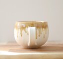 ほんのり生成色の温もりあるマット釉を全体にかけ、さらに口元に飴色に流れる釉薬を施した、大きめのマグカップです。