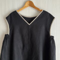 衿ぐりと袖口には黒リネンの配色パイピングでアクセントをつけました。