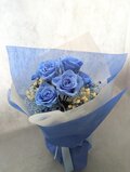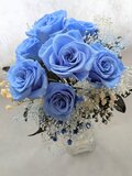 プリザーブドフラワーの綺麗な水色の薔薇を7輪とかすみ草を使用した花束。生花から加工されたプリザーブドフラワーならではの綺麗な空色の薔薇です。
