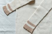 ベースの生成り色は自然に顔色を明るくみせてくれて、袖口のベージュ部分には茶色い綿を使い、ナチュラルカラーのカフボーダーが楽しい雰囲気を出しています。