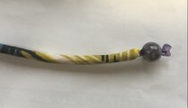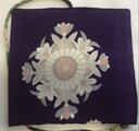 中綿を入れ、正絹の着物で作ったループを付け、ループの先にアクアマリンの玉とと山サンゴを付けています。