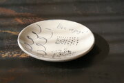 カラフルなタテ糸とヨコ糸を組み合わせて、穴やシミに合わせて縫い合わせることで、まるで芸術品のような美しい模様になるんです。私はこのダーニングが大好きで、日常的に子供たちの衣類や自分の服にチクチク針を通していたんです。ある時、ふと思いました。「うつわにもダーニングしてみたい!」そんな思いから、このシリーズの制作が始まりました。黒泥という粘土で作ったうつわに白化粧を施し、描き落としという技法でチクチクとダーニングの模様を気ままに描きました。制作していてとても楽しいです。