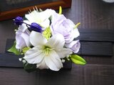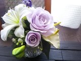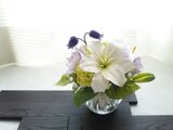 ガラス花器に白の百合と薄紫のバラが上品な雰囲気の仏花アレンジメントです。