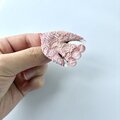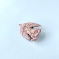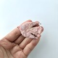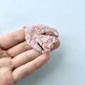 色味に合わせ、しっぽには丸いチェリークォーツとよばれる合成石を使いました。天然石とは異なりますが、透明感の中にやわらかなピンク色がかわいい人工石です。