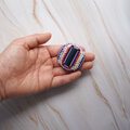 小さな作品を作るとき、まずメインのビーズを選びます。 そのビーズがいちばん美しく見えるように、隙間なく刺繍を重ねていくと── 色とりどりのビーズたちが、まるでおしゃべりしているような、にぎやかな仕上がりになります。