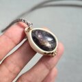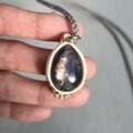 鹿角を削り出した土台に、夜空に散りばめられた星のような煌めきを秘めたアイオライトサンストーンを埋め込み、ペンダントに仕立てました。