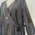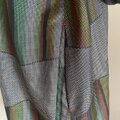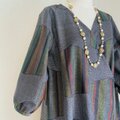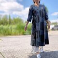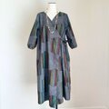 ・大島紬の着物からリメイクのワンピースです。大きな六角形の紋様がシックな中にコミカルで軽快な印象です。大変しなやかに成長した大島紬は実に肌心地の良いものです。