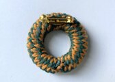 木材をドーナツ板に加工して毛糸を巻いたブローチです。