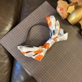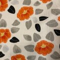 朱橙の椿を主役に、薄鼠~チャコールの抽象化した葉を大小リズミカルに散らしたレトロポップな意匠です。花芯のレモンイエローがアクセントとなり、白地の清涼感とオレンジの華やぎが軽やかに調和。