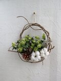 ふんわり白い綿の実と ホップの緑が 素敵に 引き立てあう 爽やかな雰囲気の リース!